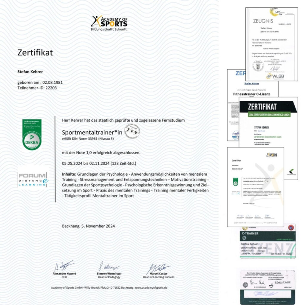 DfB Trainer C-Lizenz(Spezialisierung auf Kinder & jugendliche). Sportmentaltrainer. Athletiktrainer Fußball. Soccerkinetics Coach. Fitnesstrainer C-Lizenz.